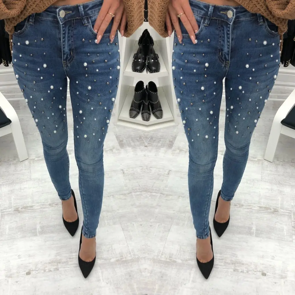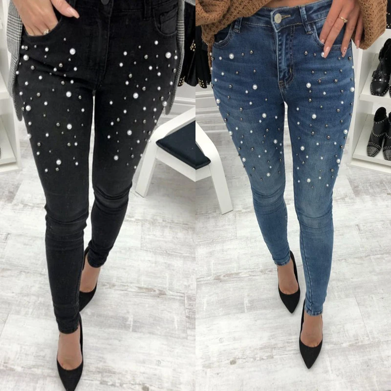 amazing 2Color Denim Pencil Pants Ladies Casual Slim Fit Rivet Pearl Jeans 2019 Summer Long Trousers For Wo